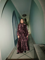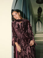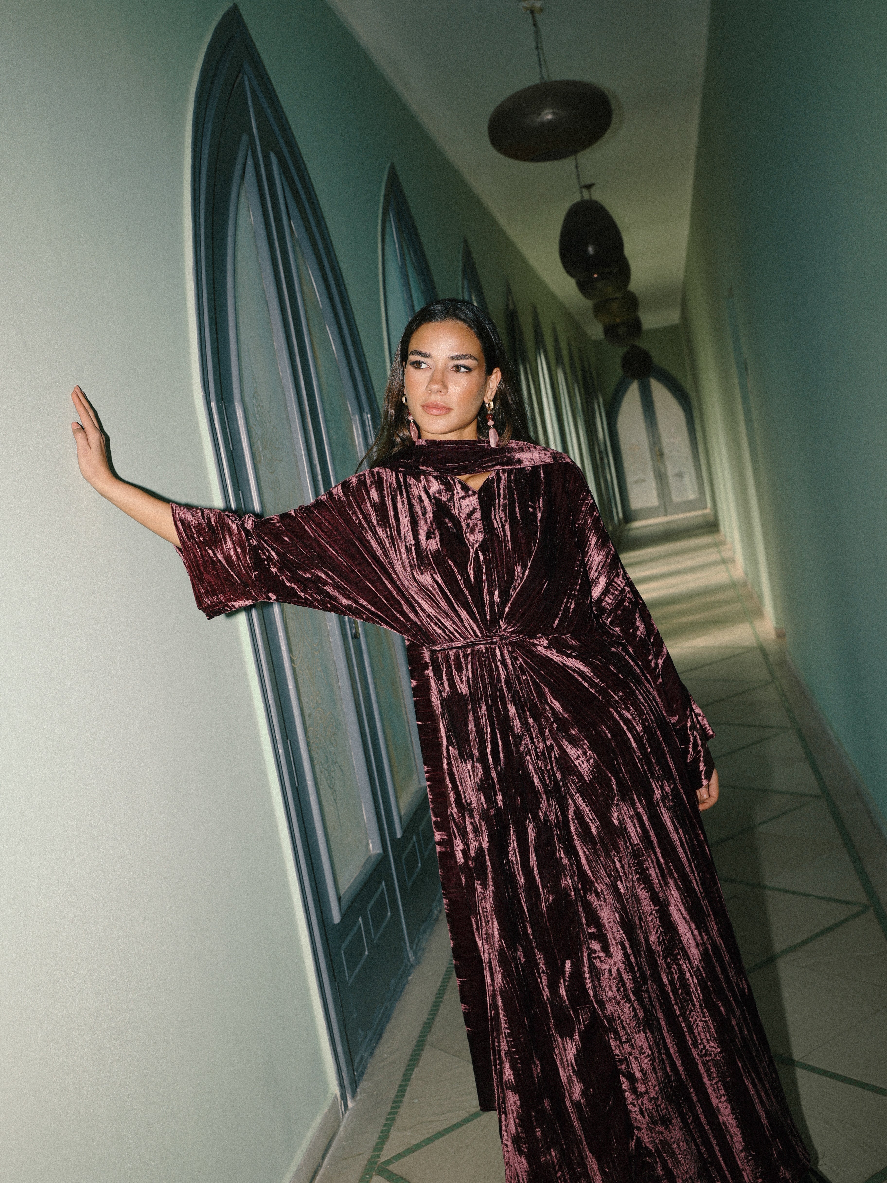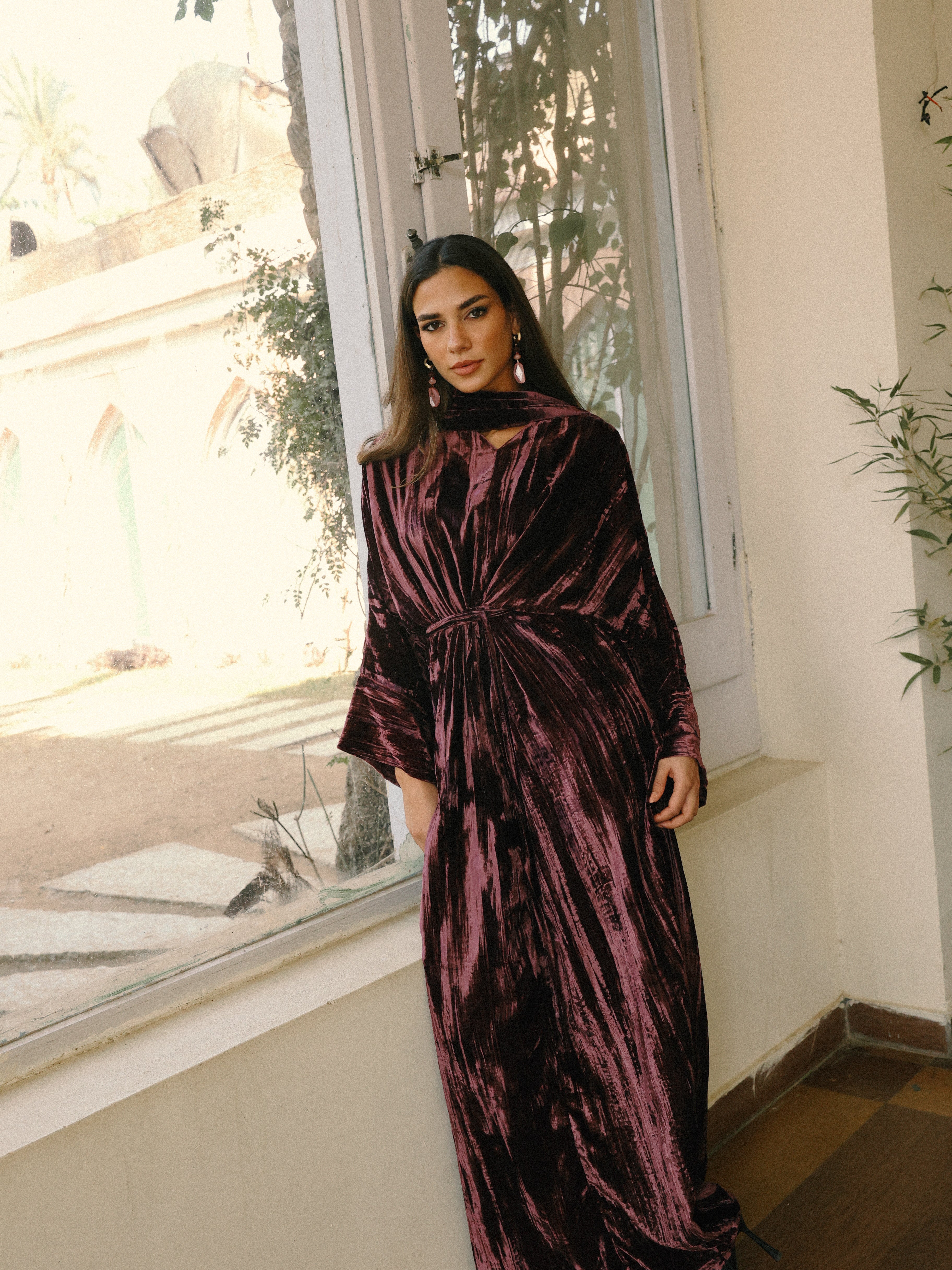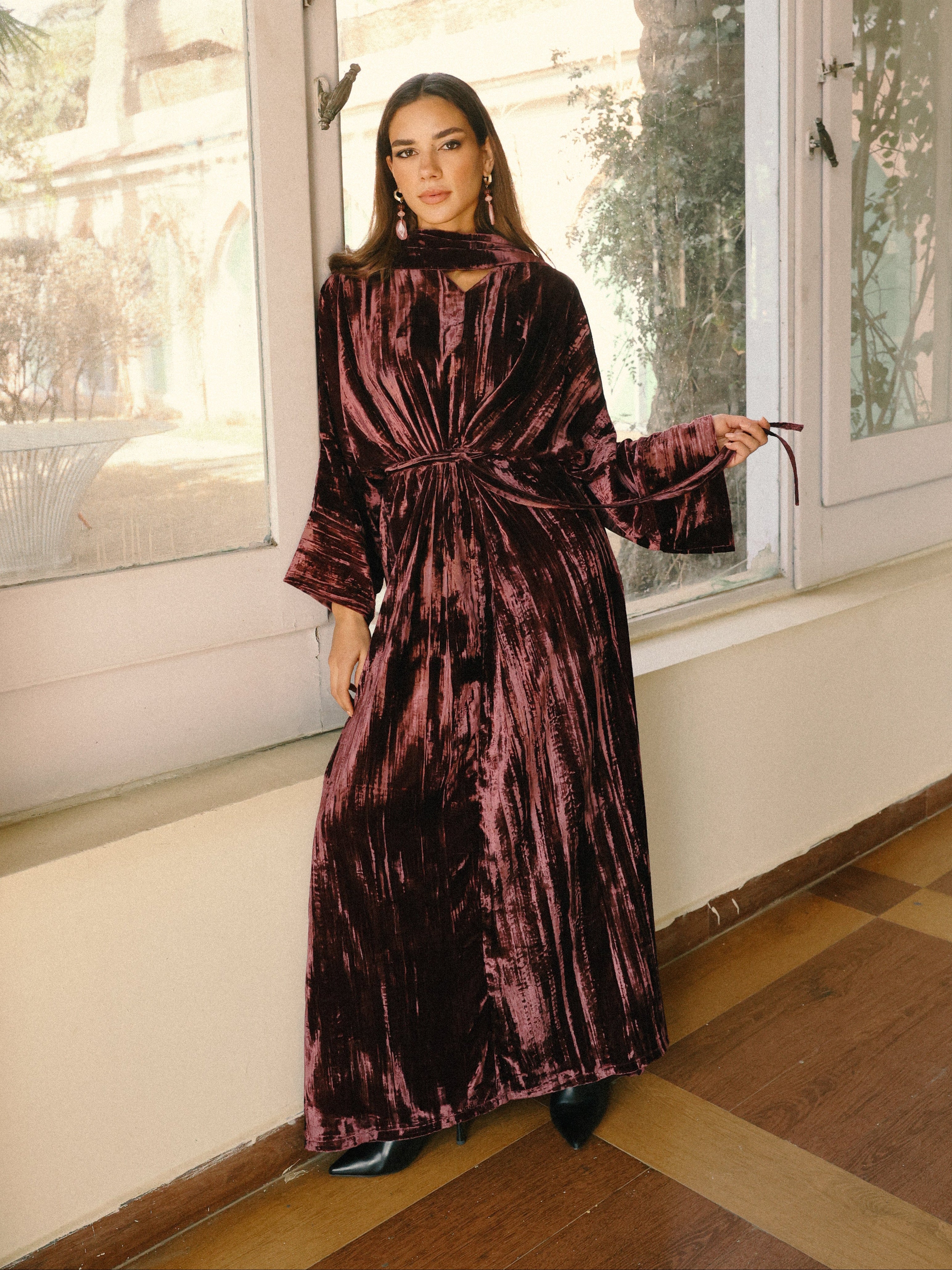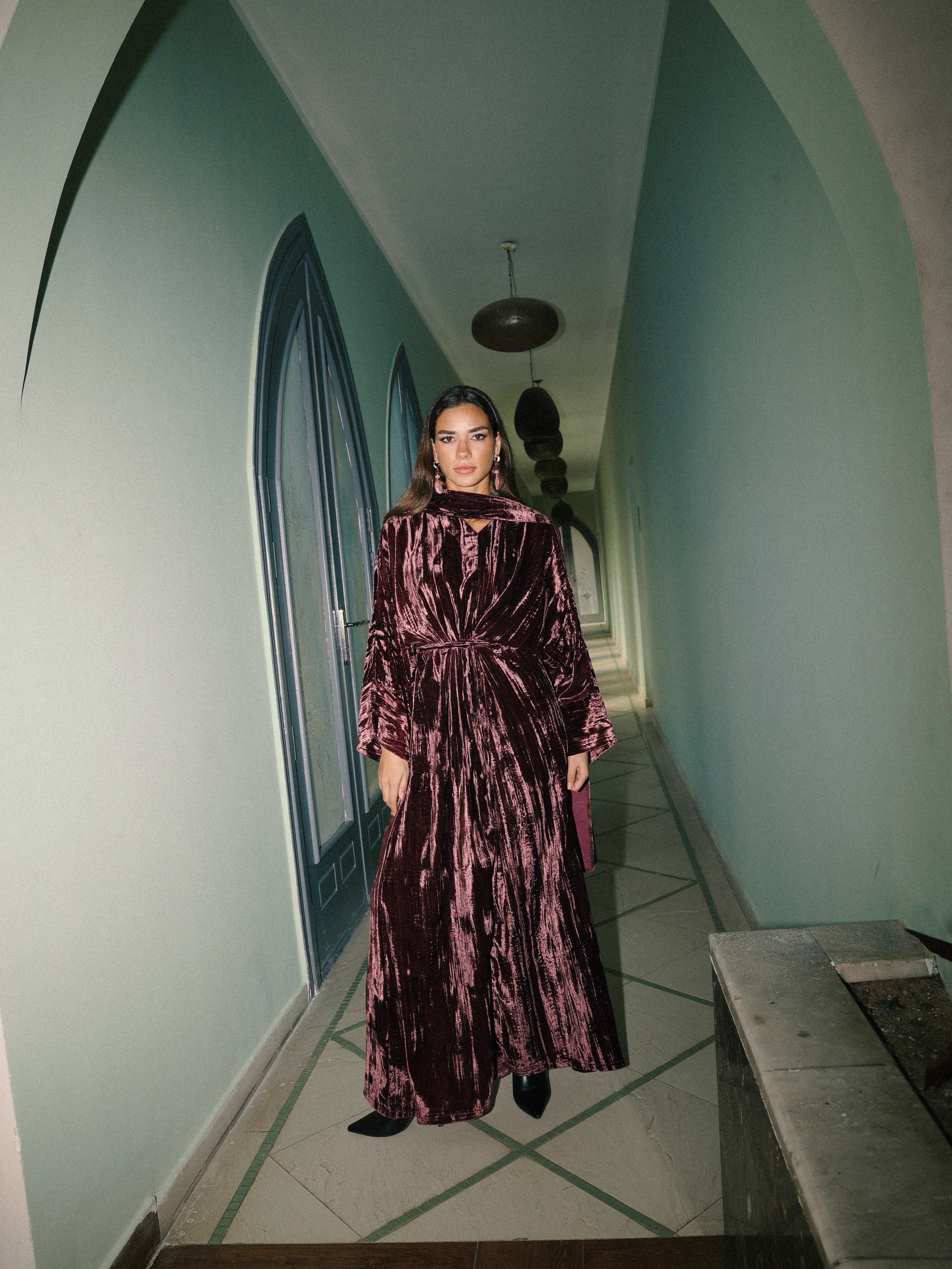 Details Maxi wrap dress in luxurious crushed velvet Adjustable wrap design with two front strings to tie and define the waist Soft V-neckline with elegant drape Wide statement sleeves for fluid movement Matching velvet scarf included, designed to be styled around the neck Designed for elevated evening and Ramadan occasions Fabric & Care Premium crushed velvet with luminous texture Soft, smooth feel with subtle sheen Medium weight with graceful drape Dry clean recommended Steam lightly from the inside to maintain texture Sizing & Fit Adjustable wrap fit for flexible sizing Maxi length Designed to cinch at the waist and flow over the body One size fits unto size Large.