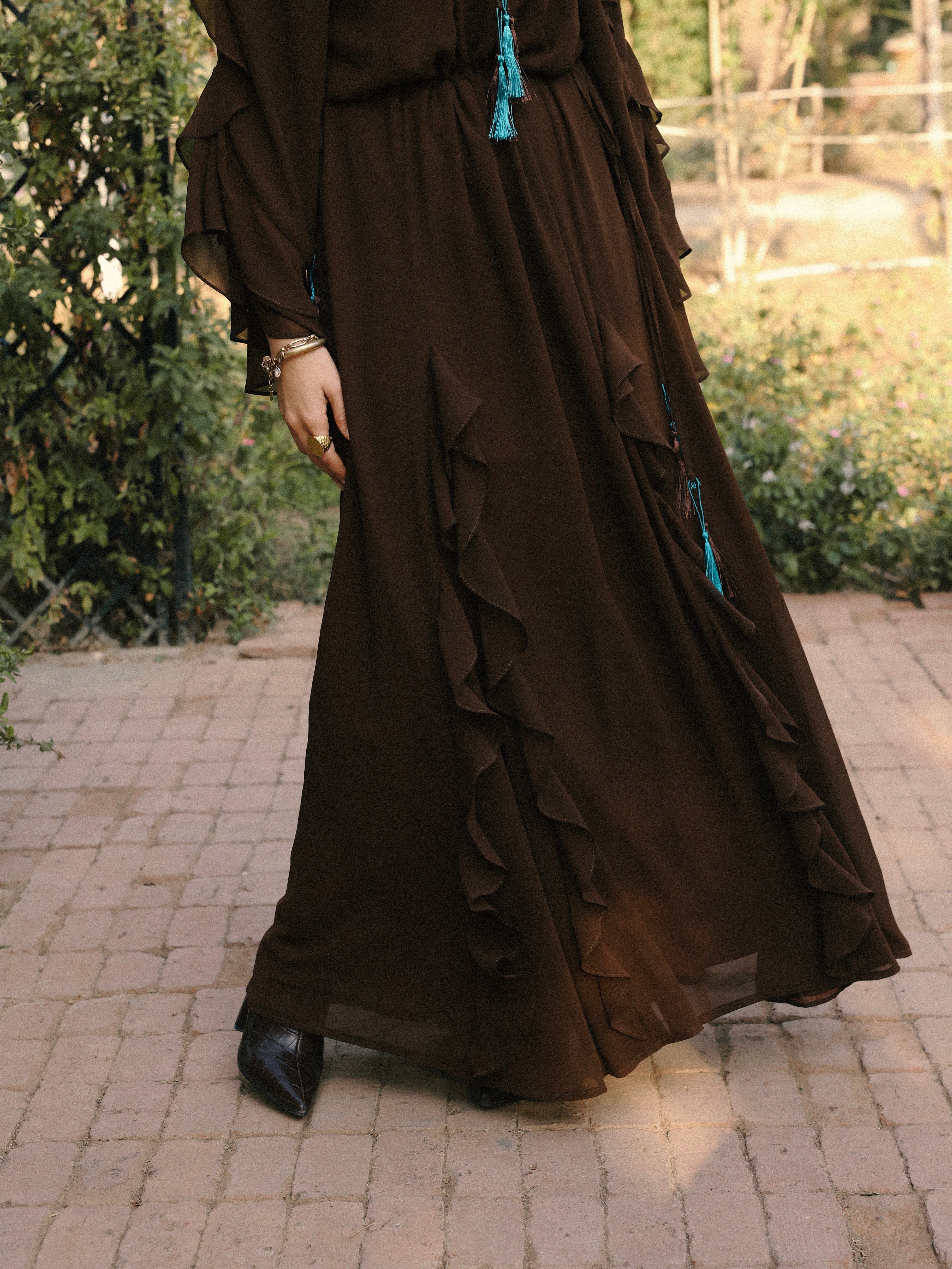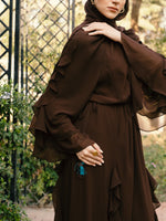 • Layered ruffle detailing along sleeves and skirt