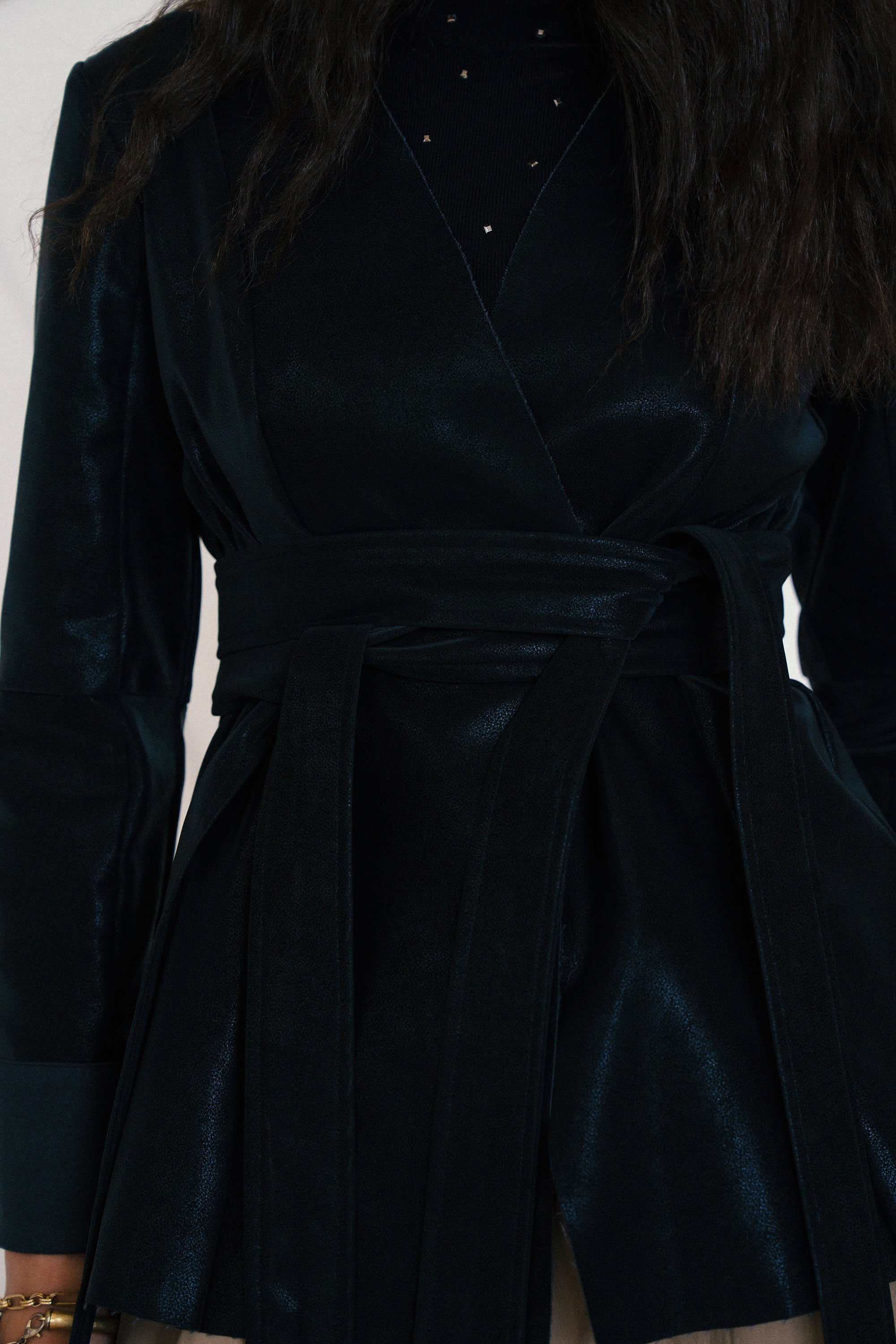 • Wrap-front silhouette with clean V-neckline