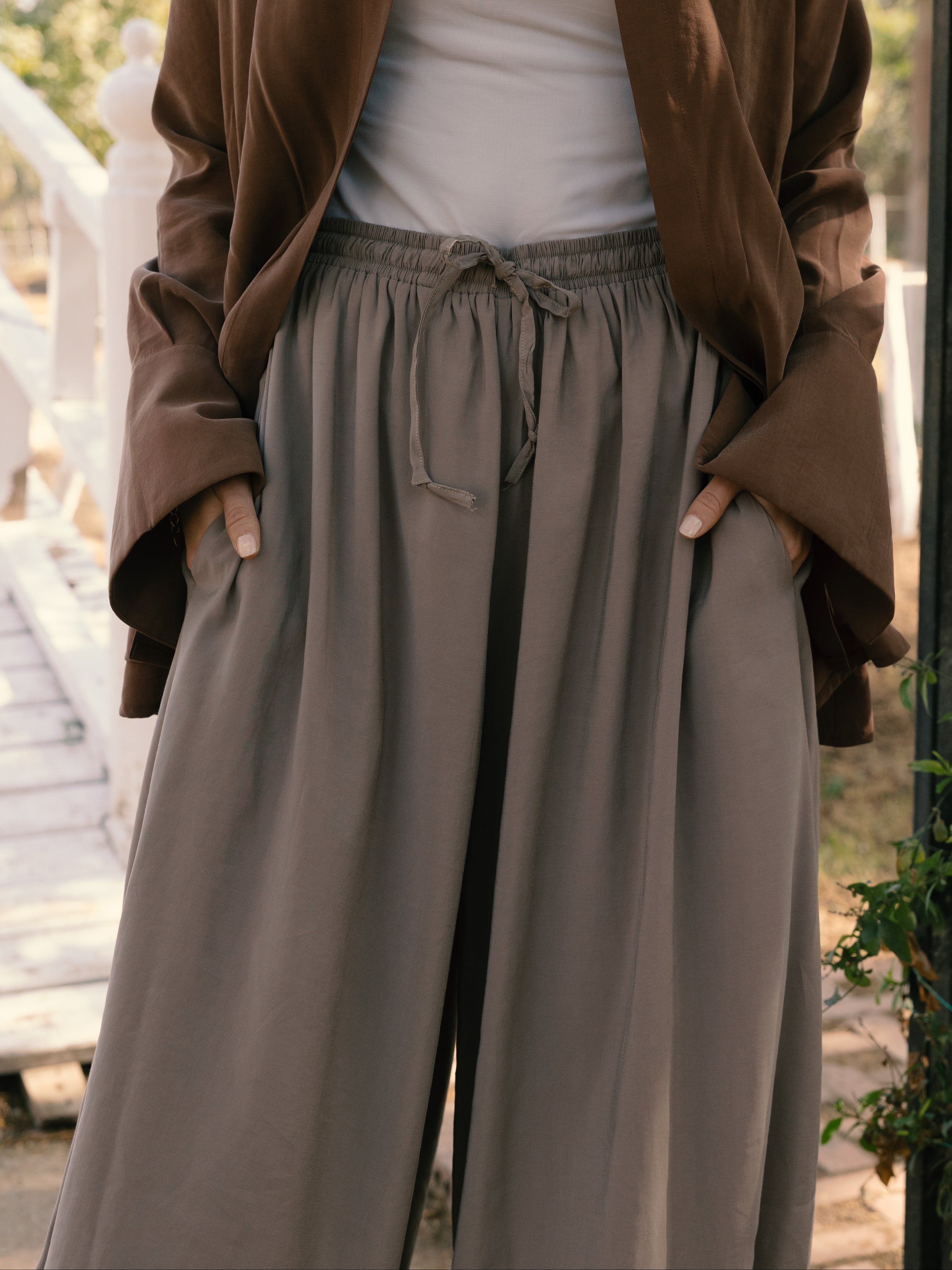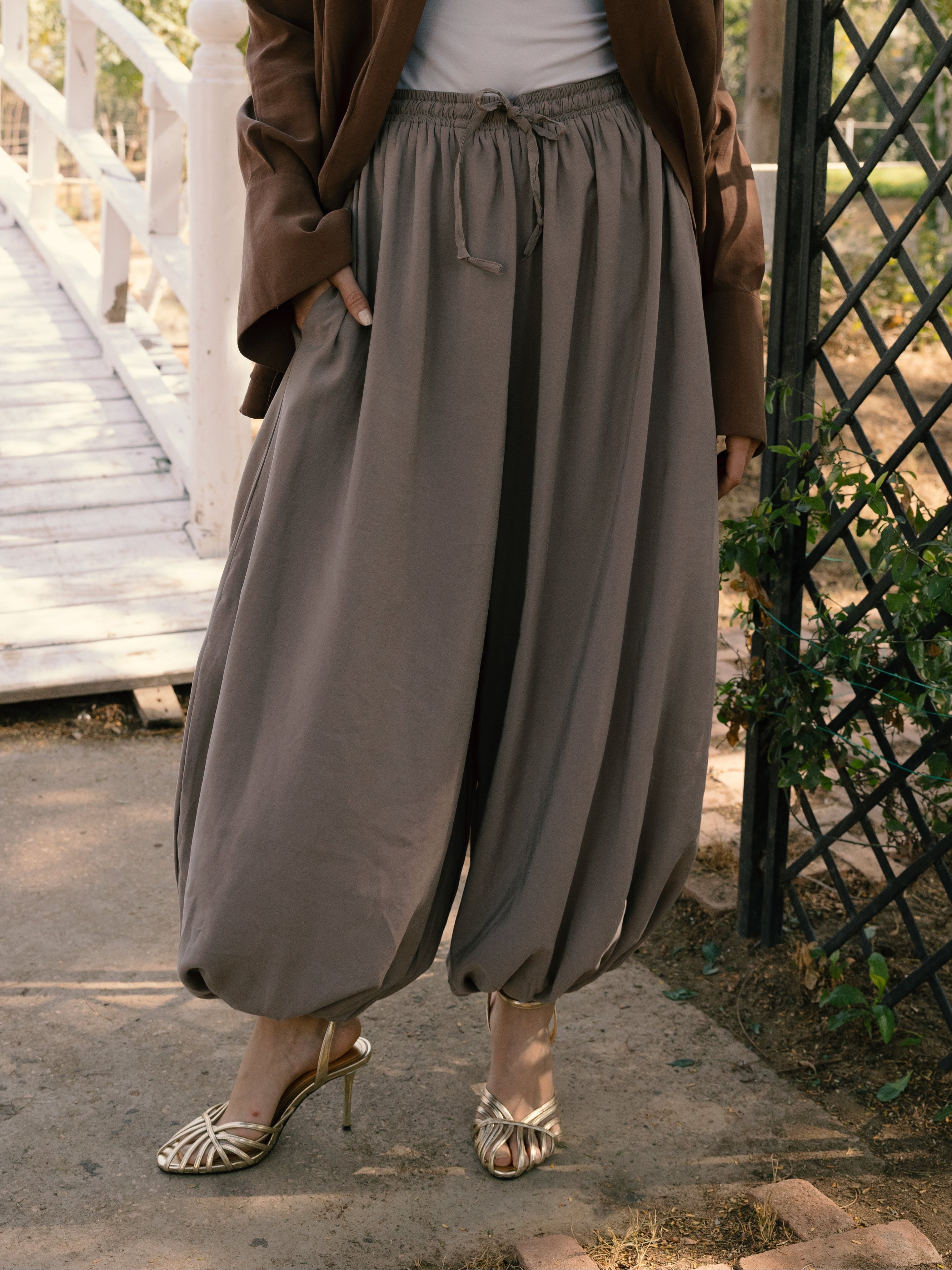 Details High-rise balloon silhouette Voluminous gathered design with soft structure Elastic waistband with adjustable drawstring Side pockets for functionality Tapered hem for a defined, sculpted shape Designed to create dramatic movement with effortless comfort Fabric & Care Smooth fabric with a matte finish Soft-touch exterior with a refined, non-shiny surface Medium weight with structured drape Dry clean recommended Steam lightly from the inside on low heat Sizing & Fit Relaxed fit with exaggerated volume High-rise elastic waist Model is wearing size Small/Medium